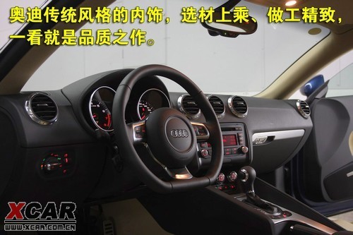 坐进驾驶舱,新TT的内饰依旧是一副奥迪的传统模样,精致的做工和上乘的选材一看就是品质之作,设计感更是与R8一脉相承,很容易让人一见钟情。中控台的设计则基本是在向传统致敬,经典的圆形主题依旧在内饰上得到了充分体现。作为选装件,在国内销售的TT并没有配备MMI系统,因此中控台的各项操作都很传统,也许在如此充满战斗气息的氛围中只有BOSE音响带来的天籁之音能让驾驶者分心。