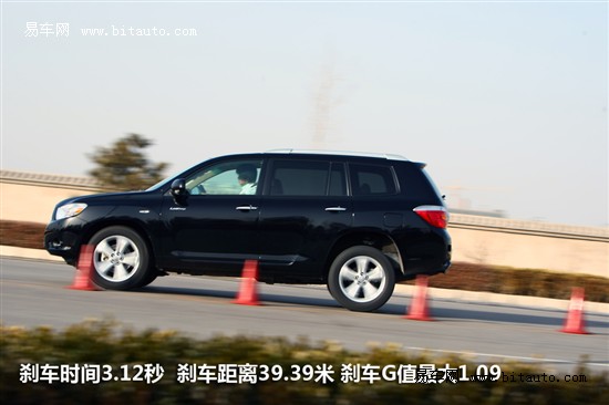 在刹车测试中,汉兰达从100公里/小时到静止,只用了39.39米,整个过程持续3.12秒。这个成绩还是相当让人满意的,4条245的宽胎也起到了很大的帮助。从曲线图中可以发现,汉兰达在整个刹车过程中G值线相对来说比较平稳,说明它始终保持了相当好的稳定性。